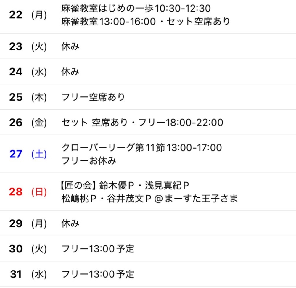 | ◯4人組様セット 月〜土 10時〜18時 6時間パック 2,200円 延長は 1時間1人様400円 ◯麻雀教室 月・土 13時〜16時 2,200円 小中高生は1,100円 ◯クローバーリーグ 点数計算できなくても参加できるプチ大会 50分打ち切り 4半荘 大人2,000円 小中高生1,000円 ◯健康麻雀フリー Mリーグルールで楽しみましょう♪ 1GAME 50分打ち切り 大人400円 小中高生200円 ドリンク・お食事は持ち込み可能です♪ 不定休 |