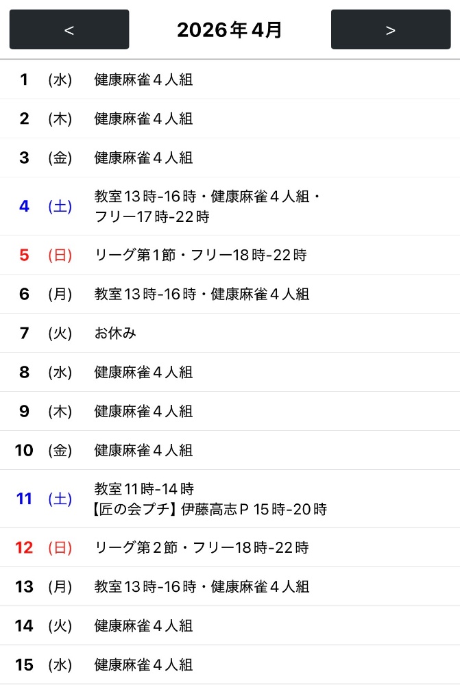 | ◯麻雀教室 月・土 13時〜16時(3時間) 2,200円 小中高生は1,100円 ◯クローバーリーグ 点数計算できなくても参加できるプチ大会 50分打ち切り 4半荘 大人2,200円 小中高生1,100円 ◯健康麻雀フリー(土日夕方よりスタート) Mリーグルールで楽しみましょう♪ 1GAME 50分打ち切り 大人500円 小中高生250円 ◯健康麻雀4人組様 月〜土 10時〜18時 6時間パック 2,200円 延長は 1時間1人様400円 ※どのコースも予約制です。一度お問い合わせください♪ ドリンク・お食事は持ち込み可能です♪ 不定休 |